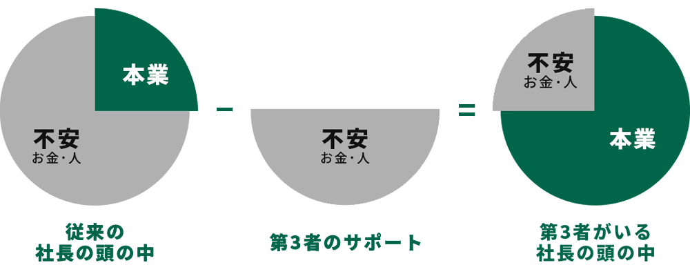 必要な利益から逆算した根拠ある売上目標、心が穏やかになる現預金残高と資本の目標を設定し、それらに基づいた行動計画を立て、現状把握をしながら軌道修正することで、経営者は漠然としたお金や人の不安から解放されて本業に集中します。