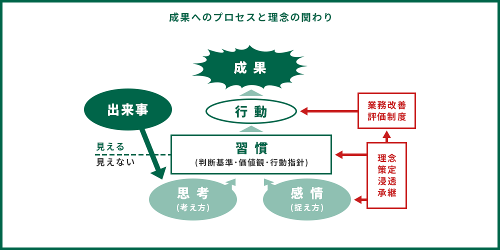 行動や成果は目に見えることで、自己や他者評価しやすいことですが、それらを根本的に改善するには目に見えない思考(考え方)や感情(捉え方)に向き合う必要があります。理念策定・浸透・承継を通して、一人一人がステークホルダー満足を追求できる思考や感情に書き換えることで、行動を成果に繋げ、さらに仕組み化していきます。